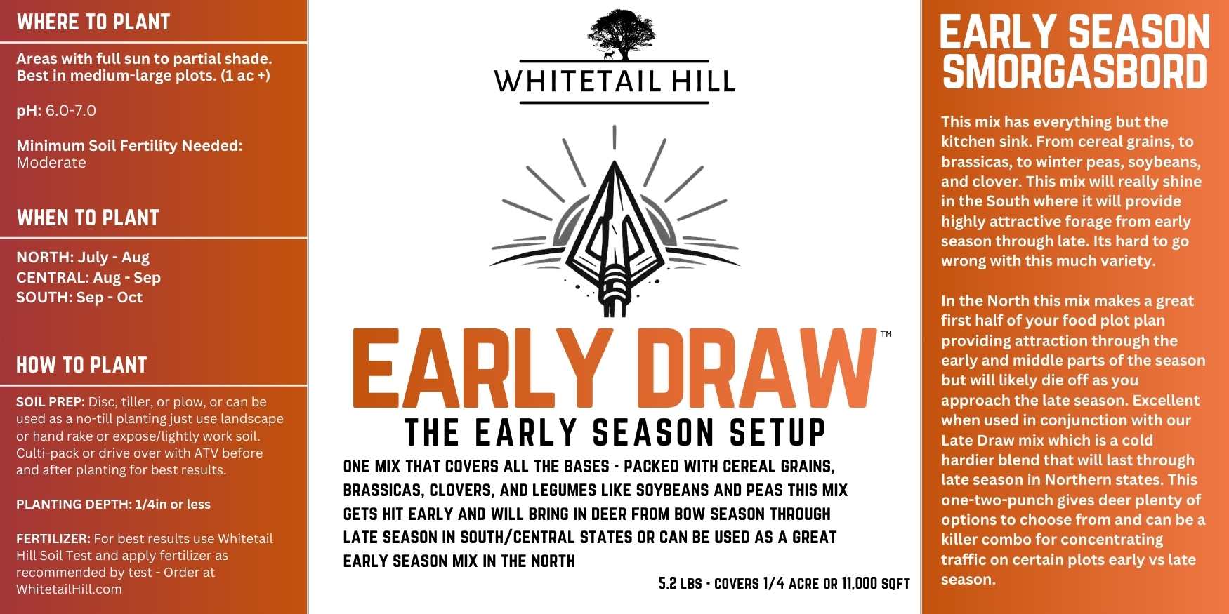 In the North, this mix makes a great first half of your food plot plan providing attraction through the early and middle parts of the season but will likely slow down as you approach the late season. Excellent when used in conjunction with our Late Draw mix which is a cold hardier blend that will last through late season in Northern states. This one-two-punch gives deer plenty of options to choose from and can be a killer combo for concentrating traffic on certain plots early vs late season. Plant one plot in Early Draw and hunt there early season and another in Late Draw as a late season hot spot.